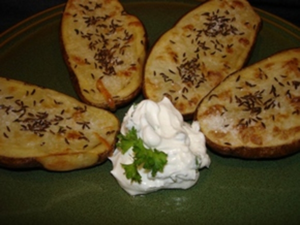 Сбрызнуть картофелины растительным маслом со стороны разреза и положить кожурой на дно формы. Посыпать солью и тмином.