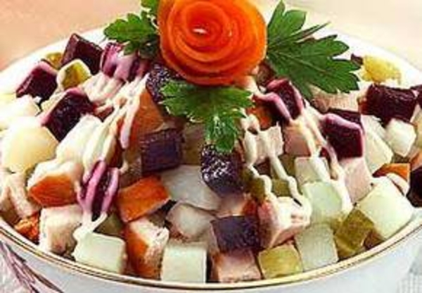 Мясо дичи, свеклу, сельдерей и маринованные огурцы нашинковать кубиками и смешать с морковью и картофелем.
