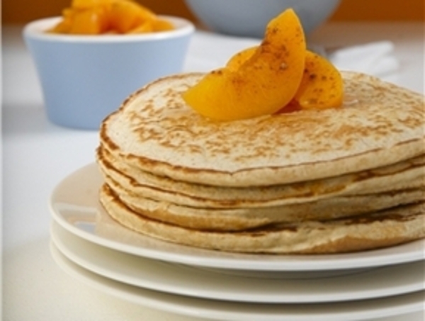Блины начинить частью персиков, сложить вчетверо и положить в сковороду с остальными персиками. Тушить блины с каждой стороны по 1 мин.