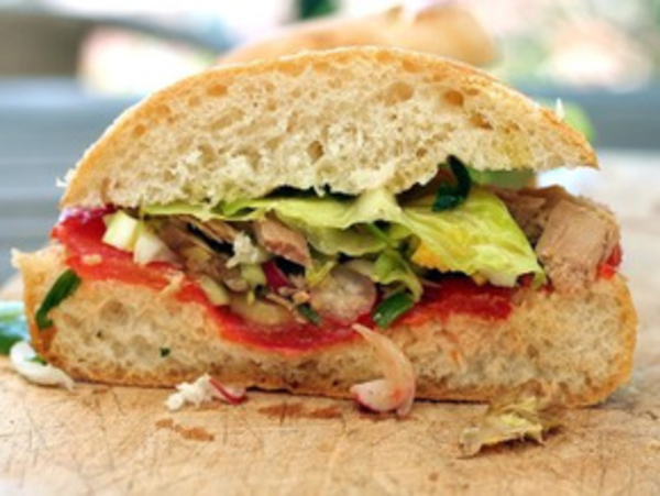 Разложить помидоры на одной половине батона, затем слоями уложить остальные ингредиенты. Накрыть второй половиной и плотно надавить сверху.