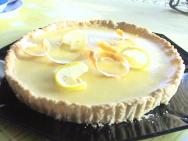 Процедить начинку и добавить в нее сливки. Медленно перелить начинку в форму – если у вашей духовки выдвигается полка, это можно сделать в духовке. Снизить температуру до 150 гр С и запекать так, чтобы начинка слегка схватилась, 30-35 мин. Остужать как минимум 45 мин. Подавать в тот же день, слегка посыпав сахарной пудрой.