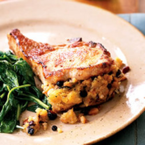 Отбивную вымыть и обсушить.В мякоти острым ножом прорезать "кармашек", в который вложить приправленную солью и перцем начинку из мелко нарезанного сыра, орехов и зелени, мясо сколоть зубочисткой.