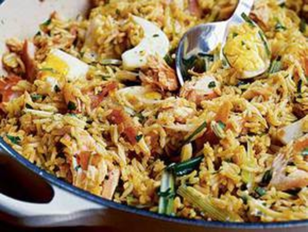 Разломать рыбу на хлопья, вынуть все кости. Добавить в смесь с рисом. Порезать яйца пополам, некоторые перемешать с рисом, посыпать паприкой.