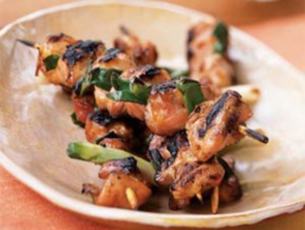 Смазать шашлыки соусом якитори, уложить в сковороду для гриля. Обжаривать на гриле 6-8 мин, переворачивая, и смазывая соусом, до готовности. Гарнировать нарезанным луком, подавать с чили и редисом дайкон, посыпанный японскими приправами.