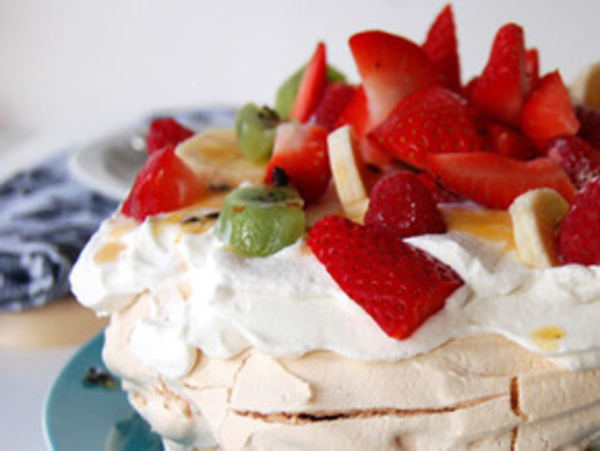Печь в течение часа-полутора при низкой температуре (150 °) и оставить торт остывать в духовке. Когда он остынет, покрыть тонким слоем взбитых сливок и уложить по краям половинки клубники. Украсить оставшимися сливками с клубникой. Можно украсить и фруктами.
