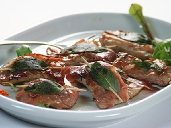 Подрезать ветчину, чтобы она подходила под куски мяса, и положить ее на куски мяса. Сверху положить листочек шалфея. Закатать рулетом и закрепить коктейльной палочкой.