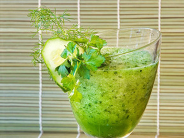Огуречное пюре соедините с лимонным соком, минеральной водой, солью, перцем, сахарной пудрой и зеленью.