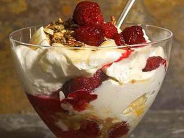 В высокие бокалы укладывать слоями малину и сливки. Украсить малиной и сразу же подавать.
