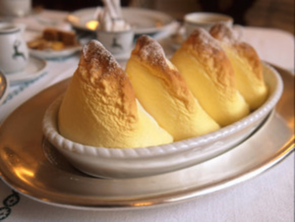 Запекать в течение нескольких минут при высокой температуре. Когда тесто поднимется - оно должно быть рыхлым, сделать столовой ложкой углубление, выложить нокерльн на подогретое блюдо углублением вверх, полить ванильным соусом и подать на десерт.