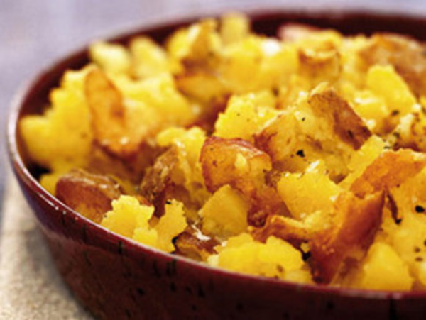 Отварить брюкву весом приблизительно 700 г в кипятке в течение 50-55 мин до мягкости. Слить и добавить запеченный картофель. Размять все вилкой, не гладко, чтобы остались комки, охладить, накрыть фольгой и держать в прохладном месте до надобности.