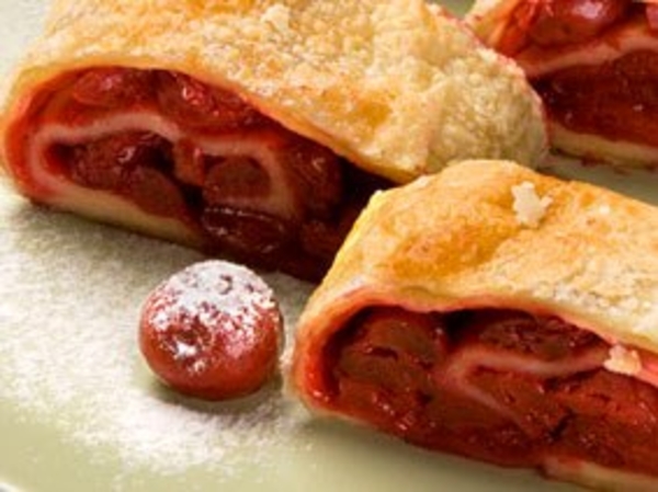 Вынуть косточки из вишен и перемешать ягоды с сахаром. Растянутое тесто обрызгать растопленным сливочным маслом, обсыпать панировочными сухарями и выложить на него вишневую массу. Подняв полотенце, закатать тесто, завернуть концы и прочно сжать их.