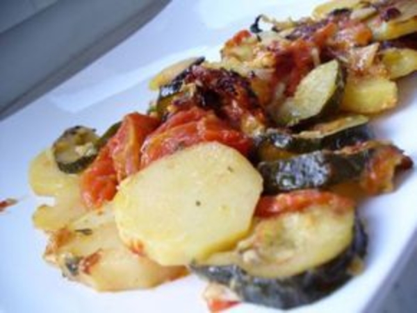 Очистить и порезать все овощи небольшими кусочками. Распределить в форме для духовки. Добавить оливкового масла и чашку горячей воды.