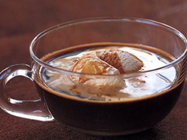Разложите по чашкам понемногу ванильного мороженого. Сварите крепкого кофе эспрессо и полейте им мороженное.