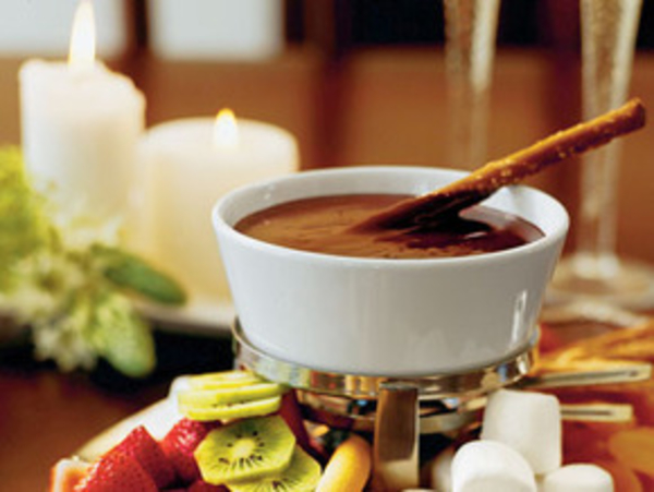 Подогреть сливки (125 мл), добавить мятный ликер (2 ст.л.). Натереть шоколад (225 г), добавить в сливки и помешивать на медленном огне пока он не растает. Перелить в горшочек над пламенем свечи.