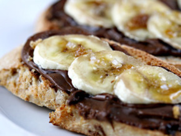 Поджарить ломтики французского батона в тостере или на сковородке, намазать шоколадным кремом и выложить на них кусочки банана. Бананы можно присыпать коричневым сахаром.