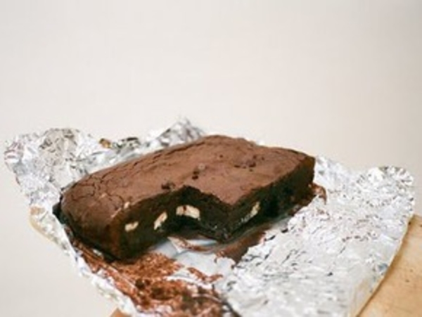 Нагреть духовку до 180.С. Выложить бумагой для выпечки форму (33х20см). Маргарин и шоколад растопить на водяной бане. Снять с огня. Вбить в смесь 300 г сахара, затем 4 яйца и ванильный сахарю Добавить муку, разрыхлитель и соль и тщательно перемешать.
