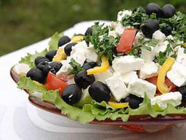Нарезать сыр на кубики, помидоры на дольки. Соединить помидоры, сыр и лук, добавить огурцы и маслины, побрызгать заправкой и перемешать.