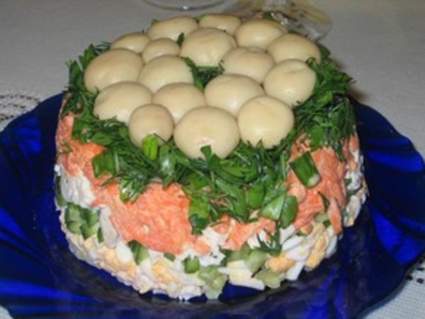 5-й - тертые сваренные вкрутую яйца, смазать майонезом;