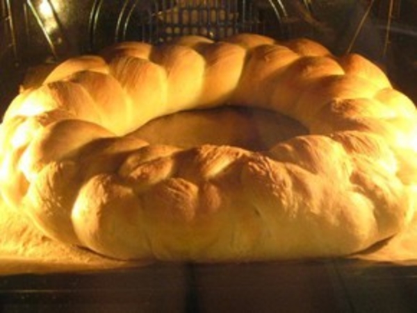 Сплести косу, соединить концы и полученное кольцо поместить с большую разъёмную форму, смазанную маслом. Накрыть и поставить подниматься в тёплое место минут на 40.