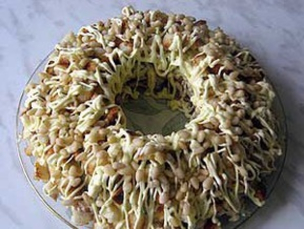 5. Обмазать майонезом, посыпать гренками. Вынуть из центра стакан, "облить" майонезом из тонкого шприца (либо из уголка), сверху посыпать кедровыми орешками.