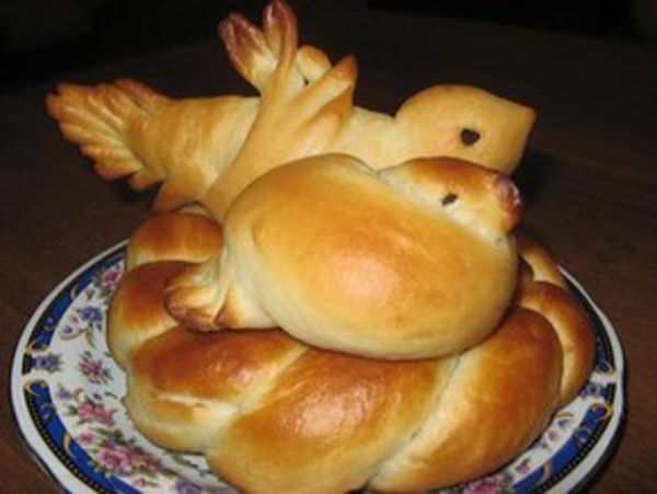 Сформуйте из теста жгут и нарежьте на куски весом по 100 г. Из них сформуйте жгуты, завяжите узлом, вылепите головку, придав изделиям форму птичек.