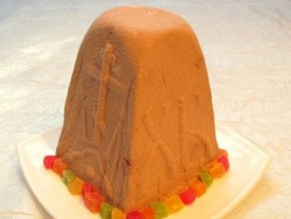 Свежий сухой творог дважды протереть через решето, смешать со сливочным маслом и сметаной, хорошо размешать, добавить нарезанные цукаты, шоколад, предварительно измельченный на терке и смешанный с сахарной пудрой. Все мешать до тех пор, пока масса не станет равномерно окрашенной.