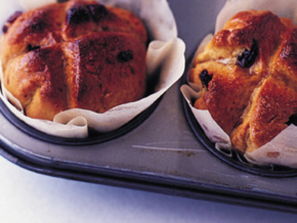 5. Замесить тесто быстро и поделить на 12 шариков, положить каждый в формочку. Вырезать на поверхности каждой булочки по кресту, накрыть пленкой или полотенцем и оставить на 30 мин.