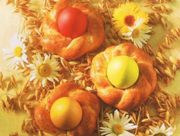 Уложим "гнездышки" на противень, смажем взболтанным желтком. Духовку разогреем до 210 градусов С. Выпекаем "гнездышки" 15-20 минут на втором уровне снизу. После выпечки вставить в середину каждого "гнездышка" пасхальное яйцо.