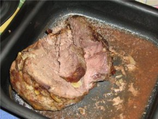 Затем вынуть, обсушить салфеткой, обжарить со всех сторон на раскаленной сковороде до золотистой корочки и довести до готовности в духовке, поливая капустным рассолом, в котором мариновалось мясо. Солить не надо. Мясо получается очень мягкое, нежное и сочное.