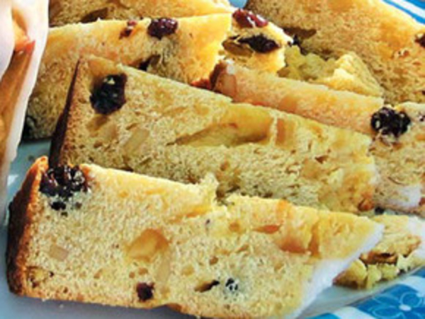 Развести 50 г дрожжей в стакане сливок и поставить из них густую опару: на 600 г пшеничной муки, два стакана сливок, толченый кардамон (10 зерен), 1 толченый мускатный орех, шинкованный миндаль (50 г), по 100 г мелко нарезанных цукатов и промытый, высушенный изюм.