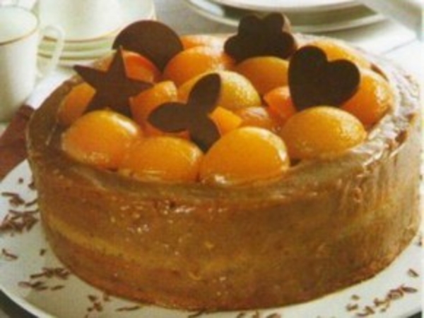 Не переставая взбивать, введите остывшую яичную массу. Дайте бисквиту остыть и разрежьте горизонтально на два коржа. Нижний корж промажьте абрикосовым джемом и кремом. Сверху положите второй корж и промажьте его так же. Боковую поверхность торта обмажьте кремом. Торт украсьте фруктами и фигурным шоколадом.
