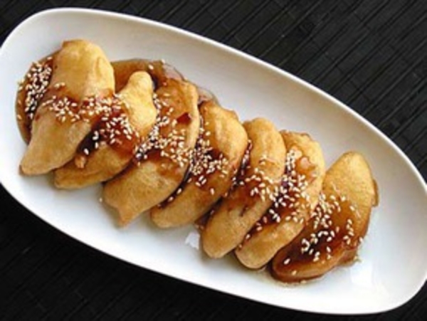 Кусочками порезать уже почищенные яблоки, обмакнуть в кляр (мука, вода, соль по вкусу) и обжарить во фритюре до появления золотистой корочки.