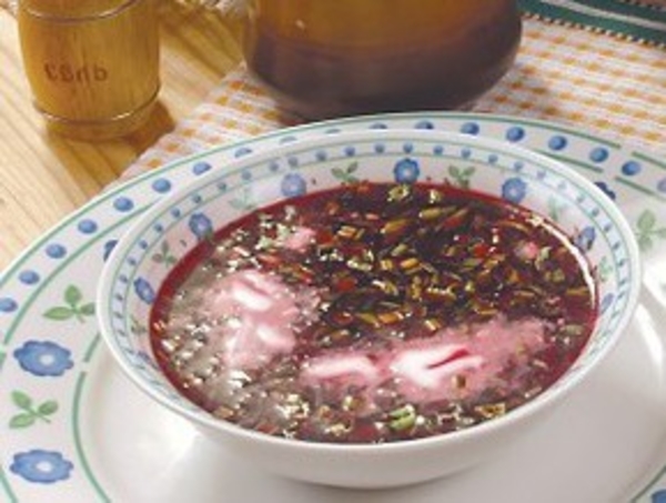 Подготовленные компоненты залить равным количеством кваса и свекольного отвара, посолить, поперчить, разлить по тарелкам, заправить сметаной и подать к столу.