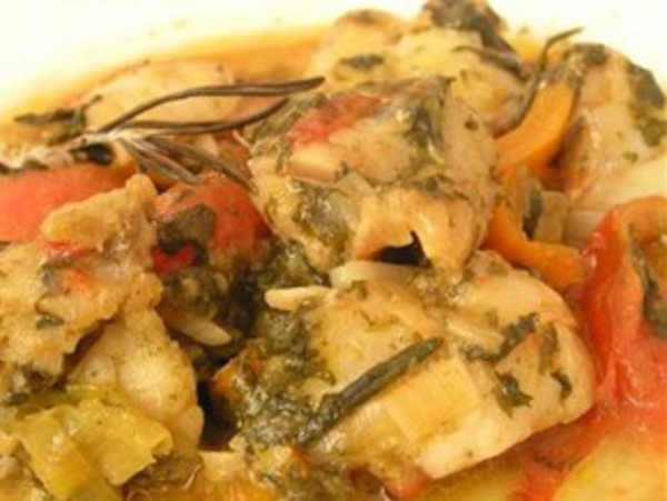 Рыбу вымыть, обсушить и нарезать кубиками. Перец нарезать толстой соломкой, помидоры – дольками, белую часть порея – кольцами, чеснок – ломтиками, щавель измельчить, розмарин разобрать на листики.