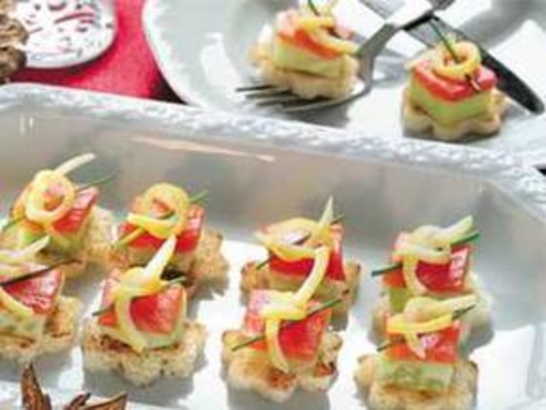 Семгу нарезать квадратиками. Из ломтиков хлеба формочкой вырезать звездочки и обжарить их до хрустящей корочки.