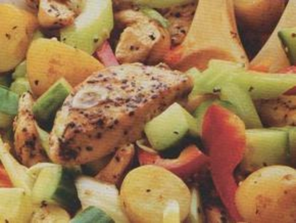 Добавьте курицу к картофелю и подогрейте. Полейте заправкой и немедленно добавьте содержимое сковородки к овощам. Хорошо перемешайте.