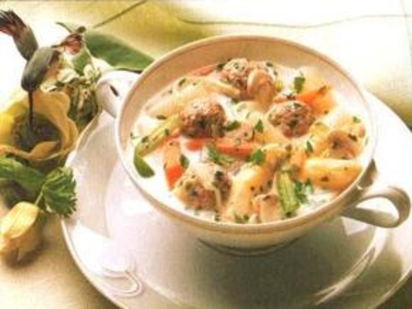 Для мясных клецок 200 г рубленого мяса перемешать с 2 ст.л. сливочного масла, 1 желтком, небольшим количеством крупчатки, 1 ст.л. мелконарубленной зелени петрушки, солью, перцем, приправить тертым мускатным орехом, сформовать клецки.