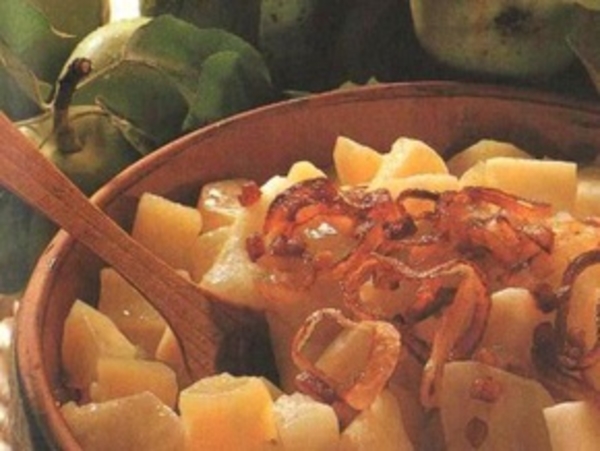 Лук очистить, нарезать дольками. Шпик нарезать кубиками, вытопить жир, обжарить на нем лук до коричневого цвета, посыпать обжаренным луком приготовленное блюдо, туда же вылить жир.