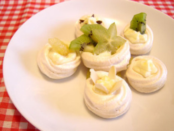 Отделить желток от белка. Чтобы приготовить меренги, белки нужно хорошо охладить и взбивать в идеально чистой посуде, добавляя сахар в три приема, причем последнюю порцию ввести уже в готовую массу и просто перемешать. Белки хорошо взбиты, если они держатся горкой на венчике и не стекают с него.