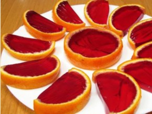 Апельсины промойте, разрежьте пополам, удалите мякоть. В полученные из кожуры апельсина "формочки" залейте желе. Поставьте в холодильник до полного застывания.