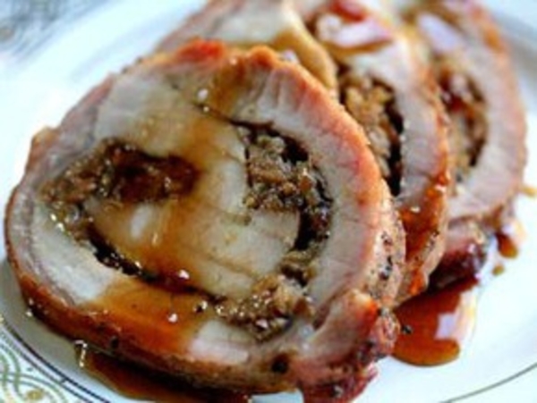 Хорошо посыпьте мясо солью и перцем. Положите начинку на мясо, равномерно распределите, оставляя по 1 см от краев. Затем, заверните туго в виде ролла. Перевяжите кухонной ниткой. Снаружи, приправьте мясо солью и перцем.