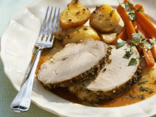 Натрите мясо тимьяном и горчичного порошком. Положить в тарелку и добавить 1 / 2 стакана соевого соуса, 1 / 2 стакана хереса, чеснок и имбирь. Затем накройте и поставьте в холодильник на ночь.