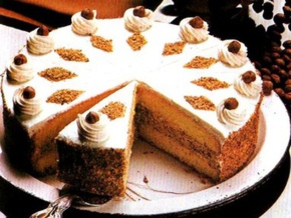 Смазать нижний слой торта сливочно-ореховой массой, наложить второй слой и слегка надавить. Смазать верх и бока кремом из кондитерского мешка, посыпать края орехами, оставленными для украшения.