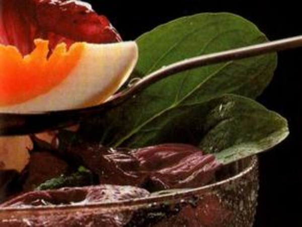 Полейте салат соусом и украсьте яйцом. Сразу же подавайте на стол.