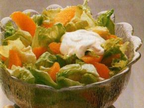 Смешайте йогурт, масло и уксус. Добавьте специи. Вылейте соус в салат и перемешайте.
