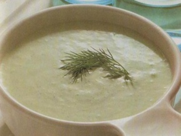 120 г сыра с перцем нарезать кусочками. Огурец, укроп, чеснок и сыр вместе с 125 г сливок растереть в пюре, приправить солью, украсить суп листиками укропа и подать к столу.