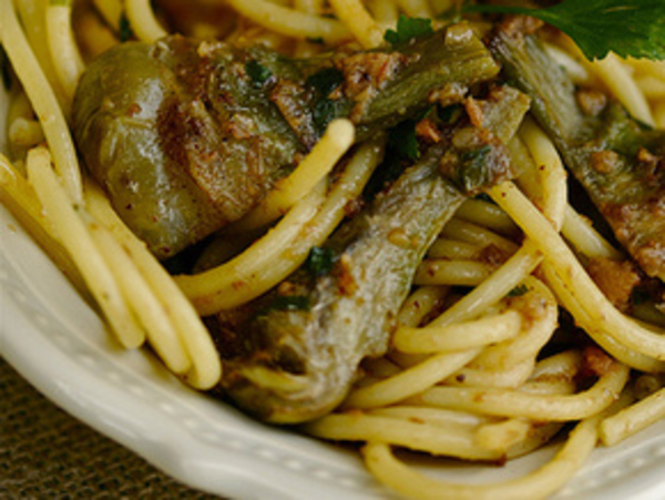 Пока артишоки тушатся, отвариваем пасту в слегка подсоленной воде - согласно инструкции на пачке, только на минуту меньше.