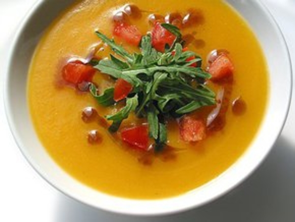 Взбить суп с помощью блендера. Налить в тарелку, добавить помидор нарезанный кусочками, рукколу и полить тыквенным маслом.