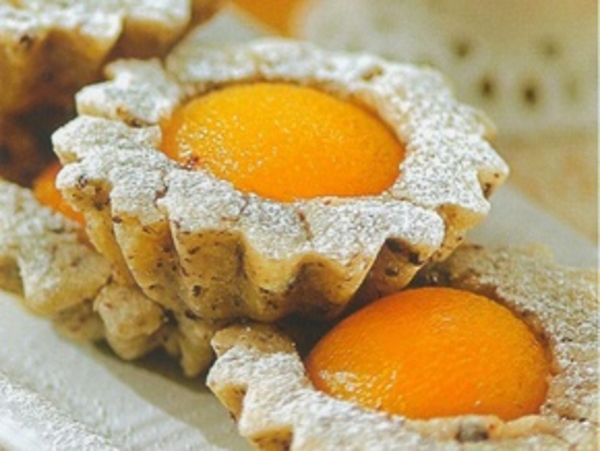 Консервированные абрикосы откинуть на сито и дать стечь сиропу. Затем выложить ягоды на бумажное полотенце, чтобы лишняя жидкость впиталась. Половинки абрикосов выложить на тесто в формочки срезами вниз и слегка прижать.