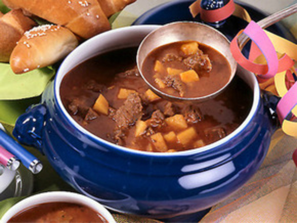 Приправить пряностями и залить кипятком, чтобы он слегка покрывал все продукты. Варить до готовности в закрытой посуде. По желанию айнтопф заправить крахмалом или пережаренной мукой и посыпать петрушкой.